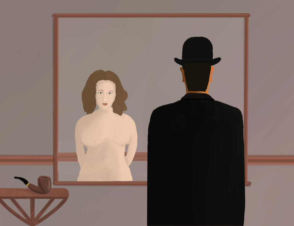 René Magritte (1898–1967) war ein belgischer Surrealist, der die Wahrnehmung hinterfragte, indem er vertraute Objekte in unerwartete Zusammenhänge setzte. Typische Motive wie Männer mit Melonenhüten, Äpfel oder Pfeifen erscheinen in rätselhaften Szenen. Sein Ziel war es, das Vertraute fremd wirken zu lassen. Um eine eigene Version in seinem Stil zu gestalten, wurden seine wiederkehrenden Elemente – etwa ein Mann im Anzug, eine Frau oder eine Pfeife – mit seiner surreal-realistischen Bildsprache kombiniert.